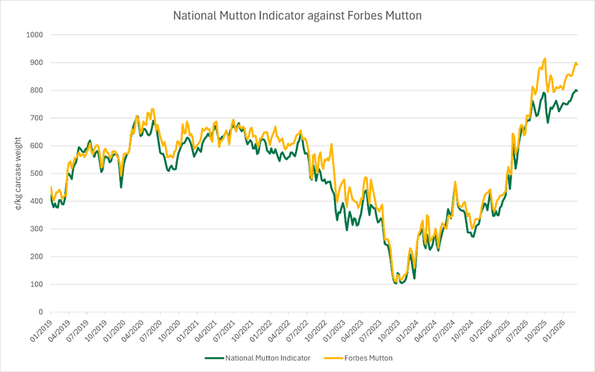 While mutton in Forbes generally achieves strong results – averaging an 8% premium on the Mutton Indicator since the start of 2019 – the recent performance since September 2025 is a good indication of increased competition among processors and exporters in the area against a tightening supply.